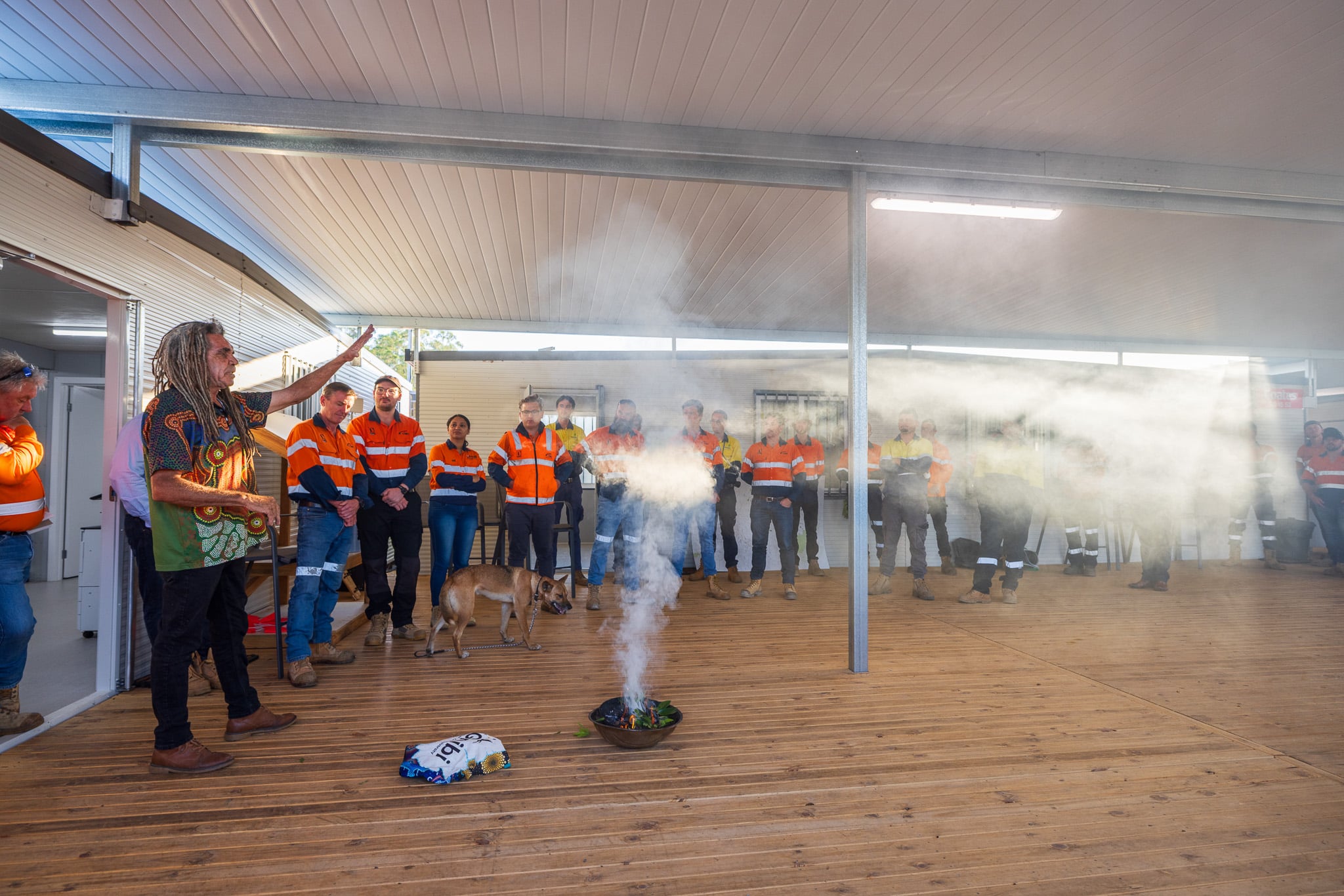 As the CMC HULL Joint Venture established our main compound for the Lismore flood recovery portfolio, we were honoured to participate in a powerful smoking ceremony led by Gilbert Laurie, a proud member of the Yaegl and Widjibal tribes of the Bundjalung Nation.